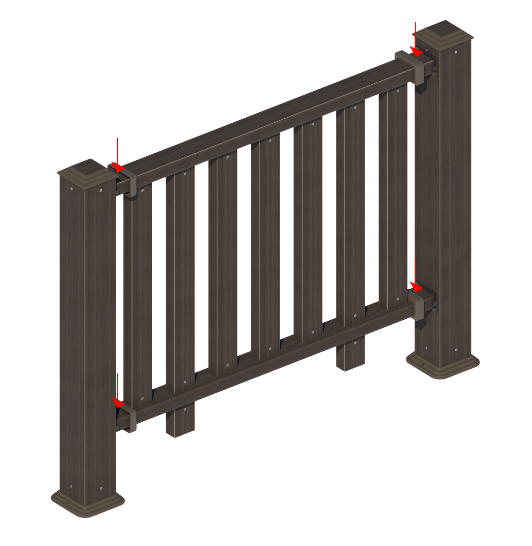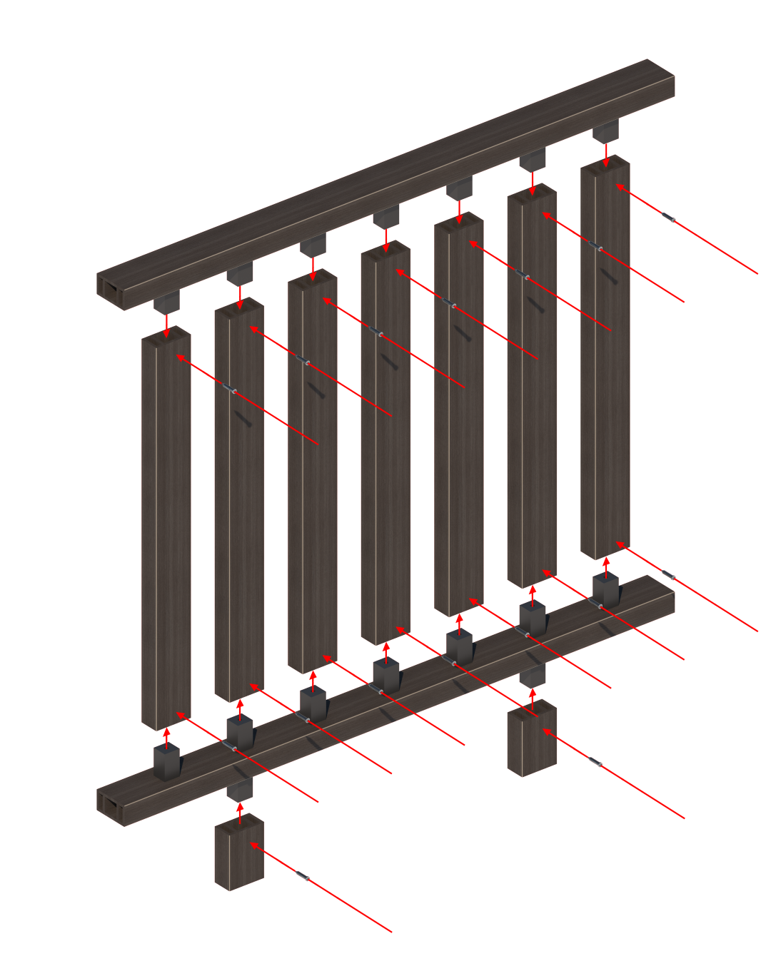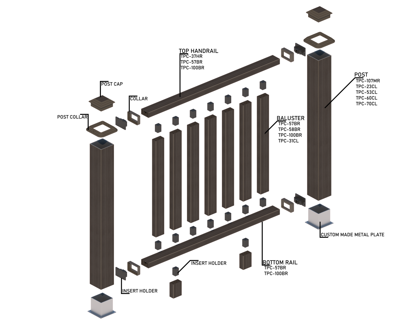 We enclose an exploded view of the Railing to show all the parts of the railing and at the same time to illustrate how any broken or damaged parts can be replaced without dismantling the whole system.